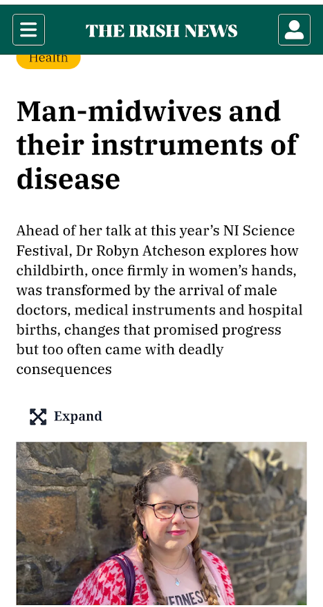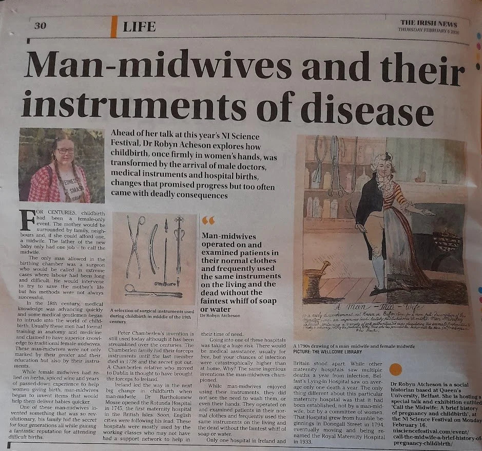 In the countdown to my event at NI Science Festival 2026, I wrote a piece for The Irish News on male midwives and their instruments of disease. Call the Midwife! A Brief History of Pregnancy and Childbirth will take place on 16th February in the Great Hall at Queen’s University, Belfast and will give an overview of how people in previous centuries understood conception, pregnancy and giving birth.